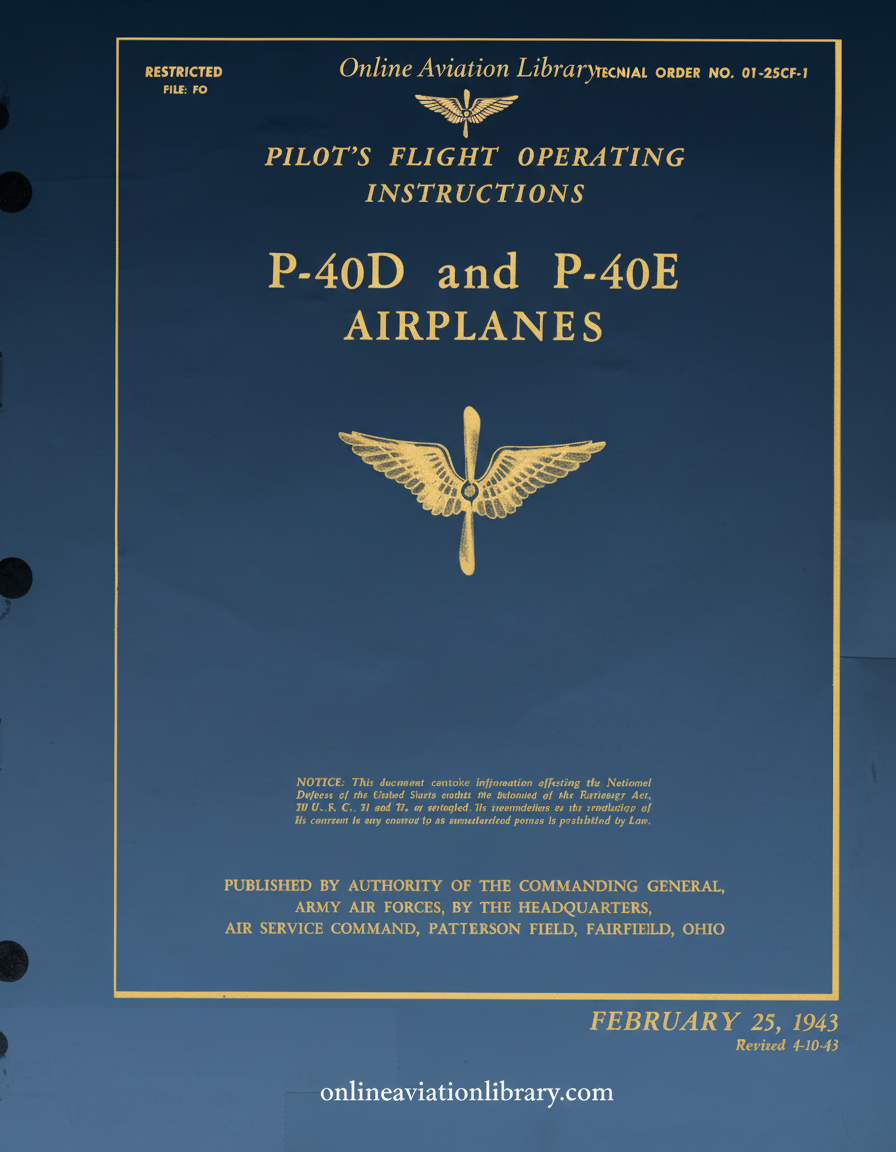 - Curtiss P-40 D and P-40E Pilot's Operating Instructions Manual -T.O 01-25CF-1 - 1943