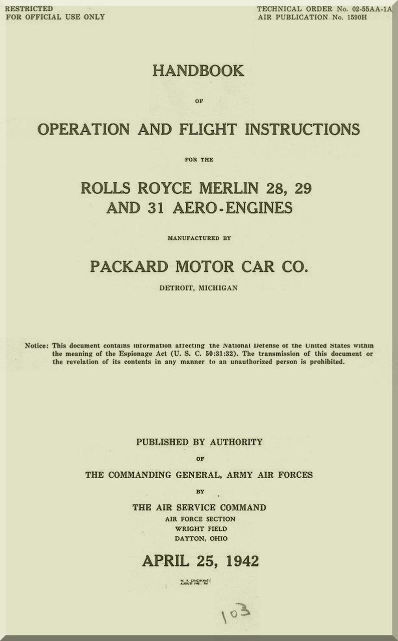 - Rolls Royce Merlin 28, 29, 31 Operator Manual ( English Language ) - 1942 - T.O. 02-55AA-1A Air Publication No. 1590H